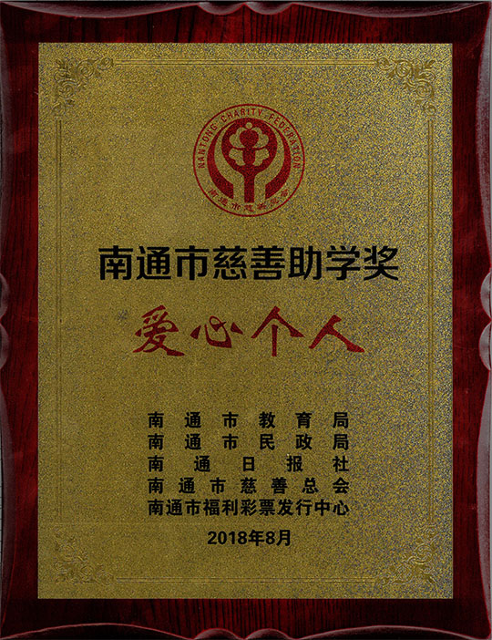 2018年8月15日,南通市教育局、南通市民政局、南通日報(bào)社、南通市慈善總會、南通市福利彩票發(fā)行中心公布了“南通市慈善助學(xué)獎”評選結(jié)果,南通三圣石墨設(shè)備科技股份有限公司董事長馮圣君、鄭輝夫婦榮獲“南通市慈善助學(xué)獎愛心個(gè)人”光榮稱號,全市僅有11人獲此殊榮。